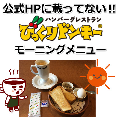 モーニングちゃん びっくりドンキーは全国に300店舗以上あるので、モーニングメニューがるのはほんの一部の店舗です‼